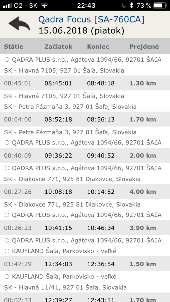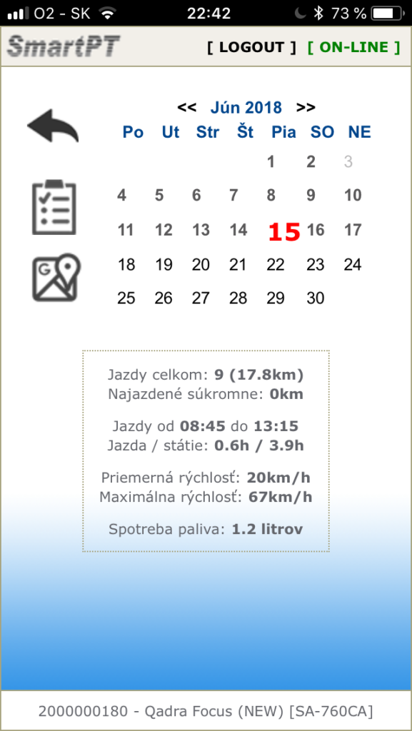• kniha jázd generovaná v reálnom čase, vo formátoch EXCEL, PDF, alebo prehľadné tabuľky na email